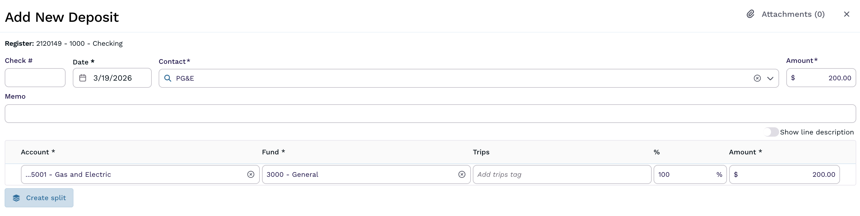 If you have received a refund for an expense that you previously recorded, then you will post a deposit transaction, but you'll use the expense account that was originally used when you recorded the purchase (instead of an income account as is typically used when recording a deposit). That way, your bank (asset) account balance in Aplos reflects the money returning to your account, but doesn't show as income because it wasn't new money received, and also decreases the original expense account used. An example below of how this might look: