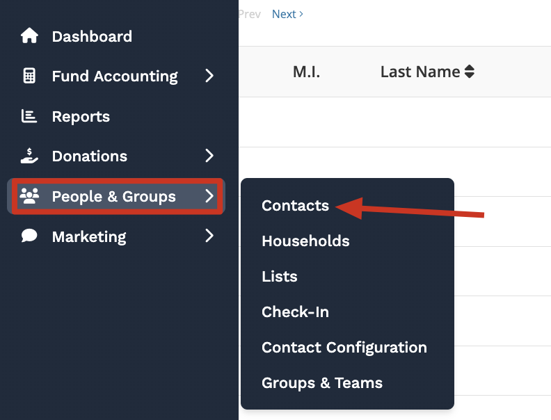 To begin navigate to the contact list by selecting 'People & Groups' in the navigation menu and clicking 'Contacts.'