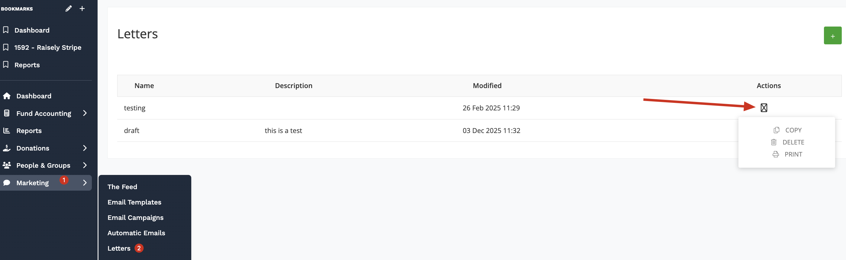 • Use the three dots under the Actions column to copy, delete, or print a letter.