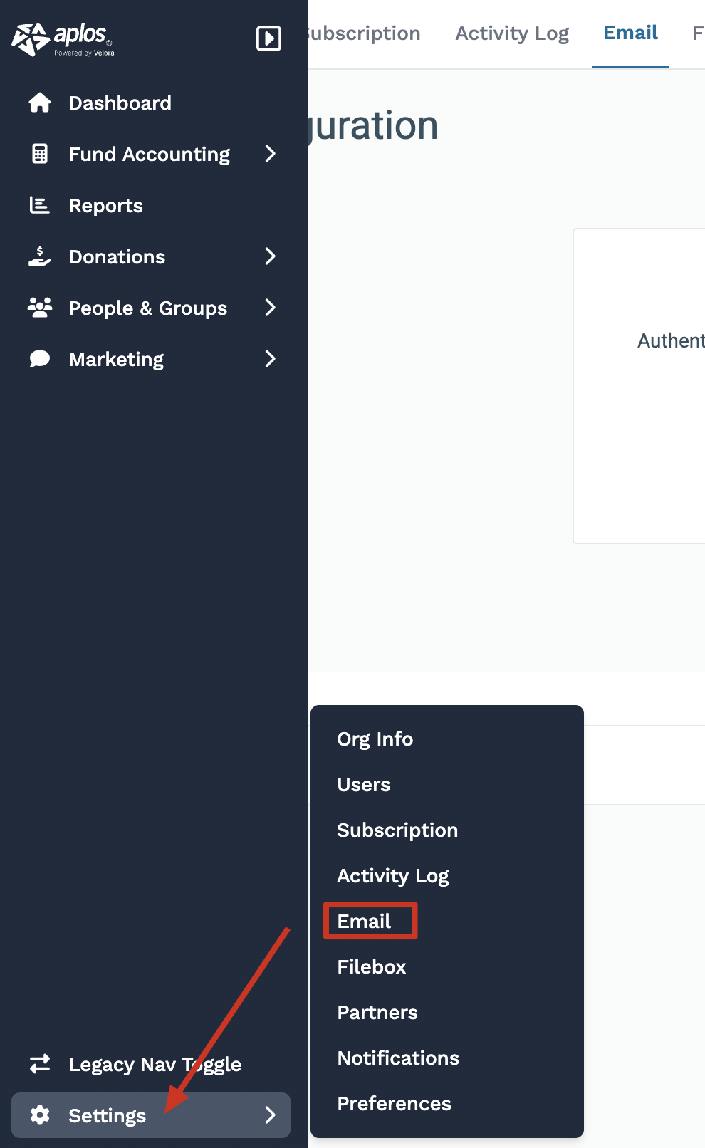 Once you have added the values into your Domain DNS settings where you host your domain, go to the Email Configuration page under Settings in Aplos.