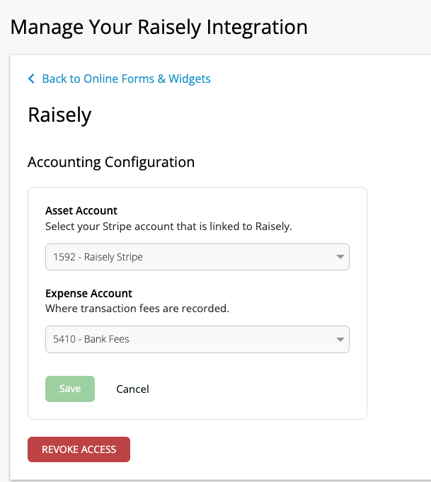 Bank Fees Expense Account: If your organization doesn't already have one, a new Expense Account for Bank Fees is created to properly track any processing fees associated with your Raisely transactions.