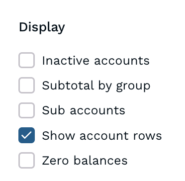 Select from Inactive accounts, Subtotal by group, Sub accounts, Account rows, Zero balances)