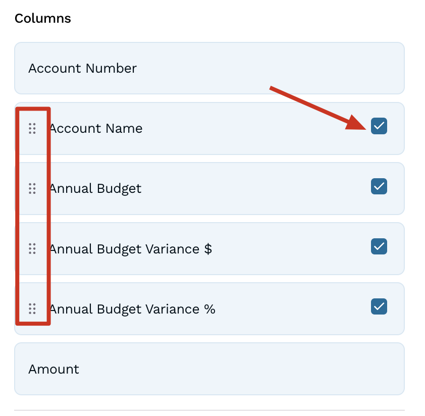- Move columns by clicking on the six dots to the left of a column name, and then dragging the column in the order you’d like it to appear on the report.