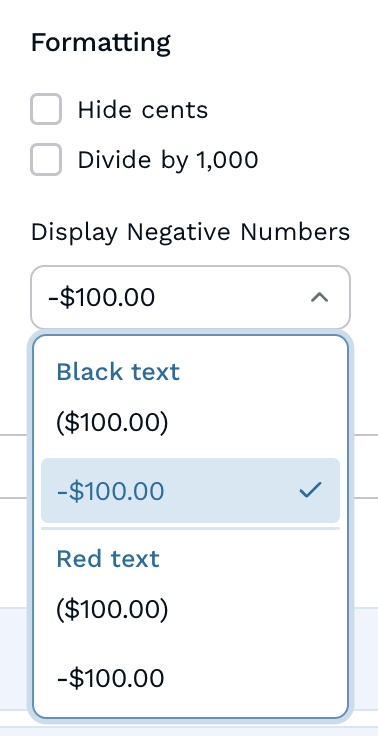 Select from Hide cents, Divide by 1,000, and options for displaying negative numbers)