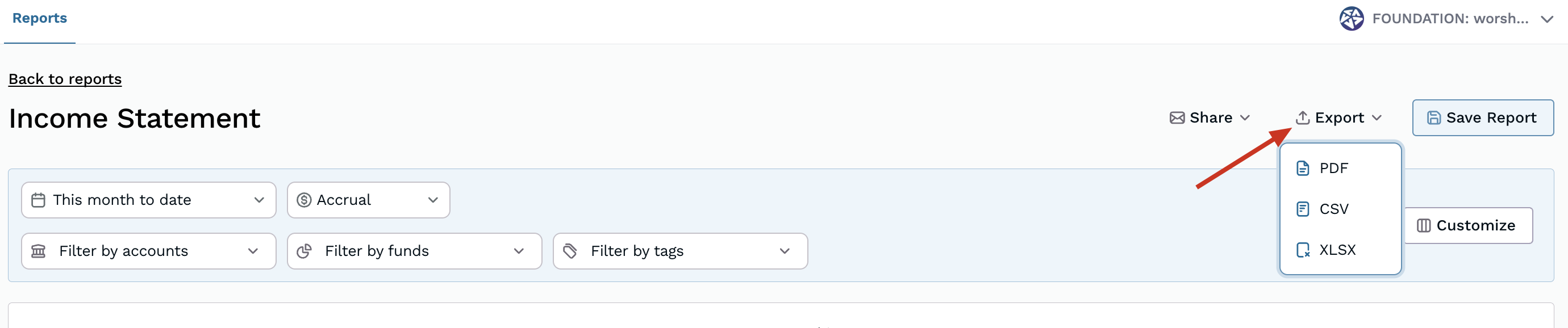 To export your Income Statement, click Export at the top right of the page. You’ll then see options to export the report as a CSV, PDF, or XLSX file. When you select one of the export options, the Income Statement will download with whichever filters you have currently applied to the report.