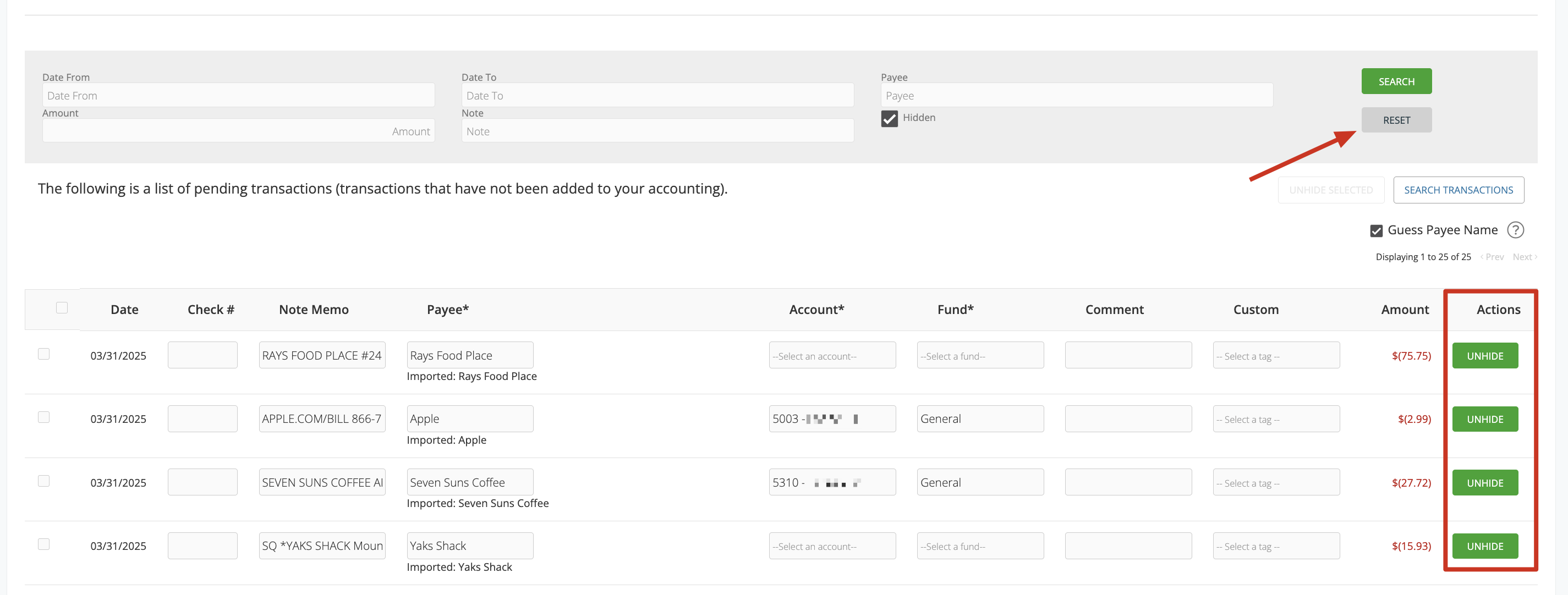 - Click Search to display all previously hidden transactions.