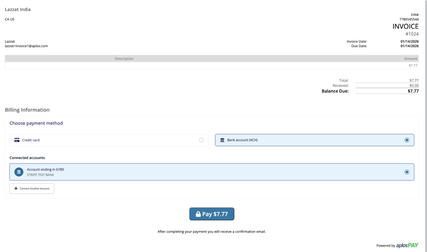 On the payment page, the customer can verify the invoice information and choose if they would like to pay via credit/debit card or ACH. they can then enter in their payment details to pay the invoice. Only the full amount of the invoice will be receivable online.