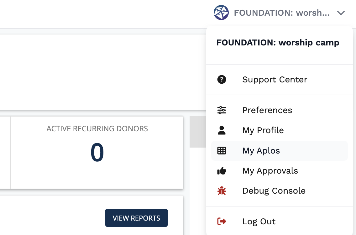 Organization Dropdown (Top Right): Click your Organization name to access the Support Center, Preferences, your personal Profile, MyAplos (for donor accounts), My Approvals (for bill pay users), and the Log Out button.