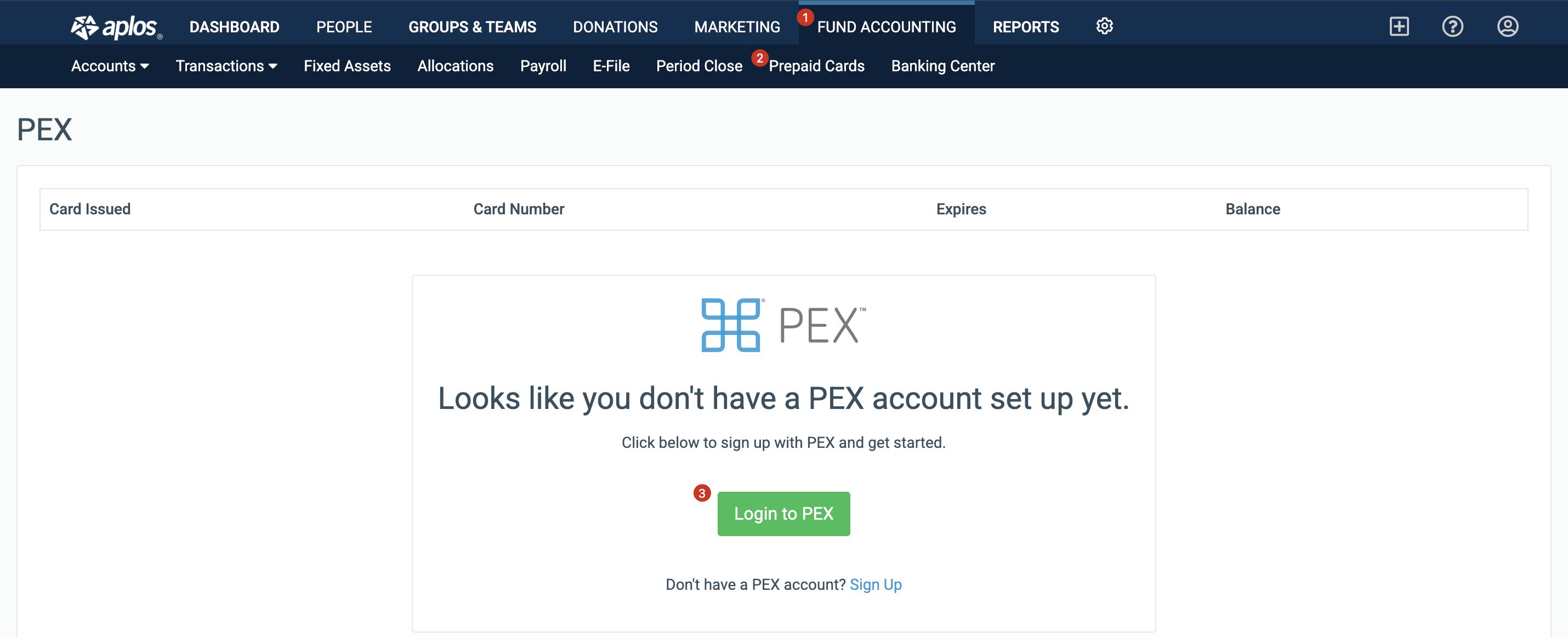 To connect your PEX account to Aplos, log in to your Aplos account. From the navigation bar, select Fund Accounting > More > “Prepaid Cards.” Then sign in to your PEX account. Click “Login to PEX” and enter your PEX credentials.