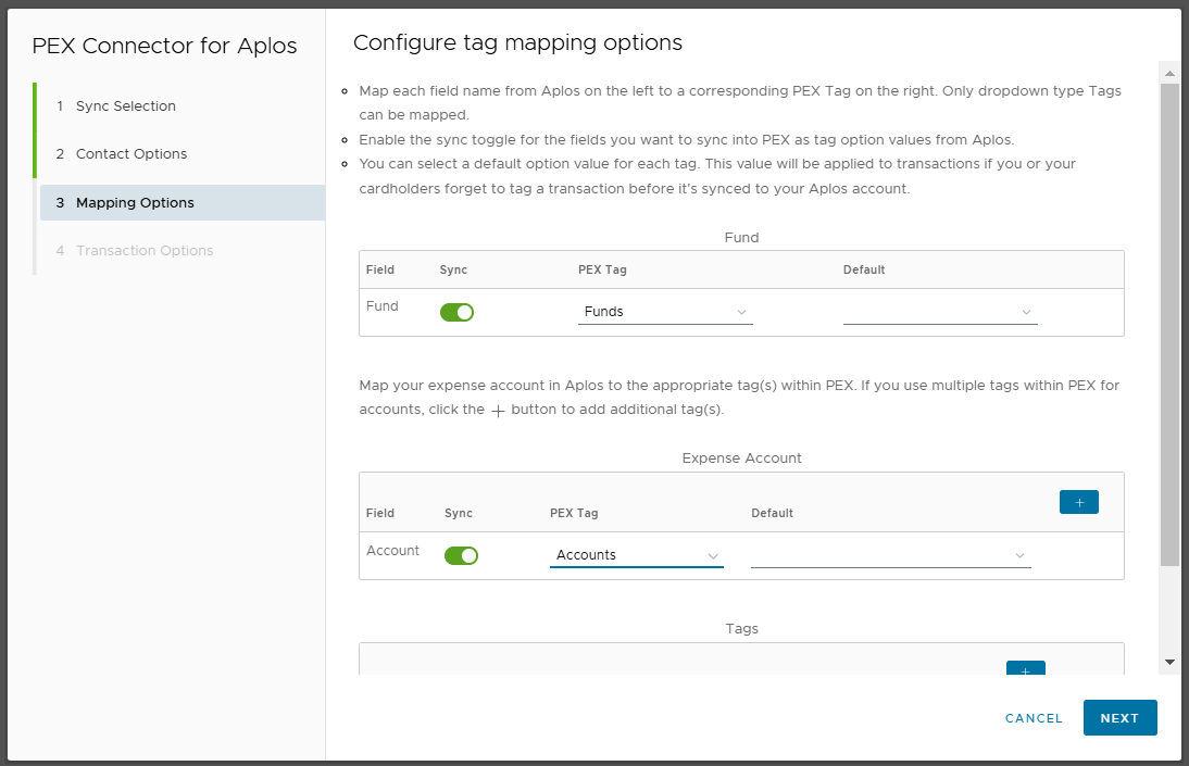 Syncing tag options is recommended because it gives you the option to import data from your Aplos account when configuring your PEX tags. For example, the values for the PEX tag will be populated with the names of all your accounts. This helps reduce manual efforts to populate PEX tags with the data from your Aplos account.