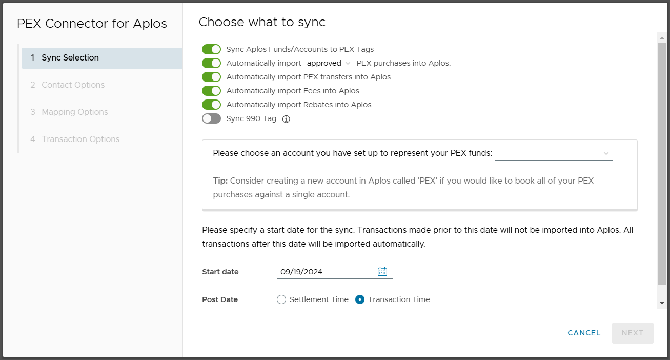 - You can choose to sync all PEX transactions (regardless of approval status) or just approved (recommended).
