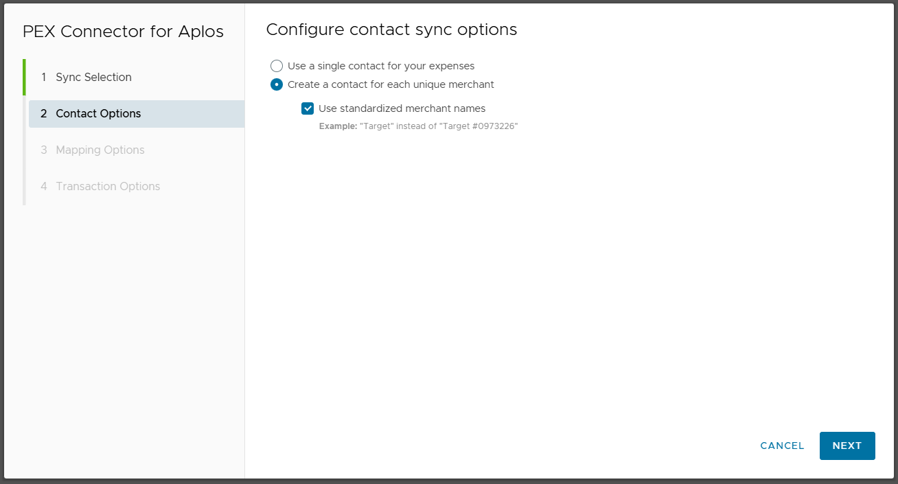 - Choose wether you wish to select a single contact for all purchases or create a unique contact for each merchant.