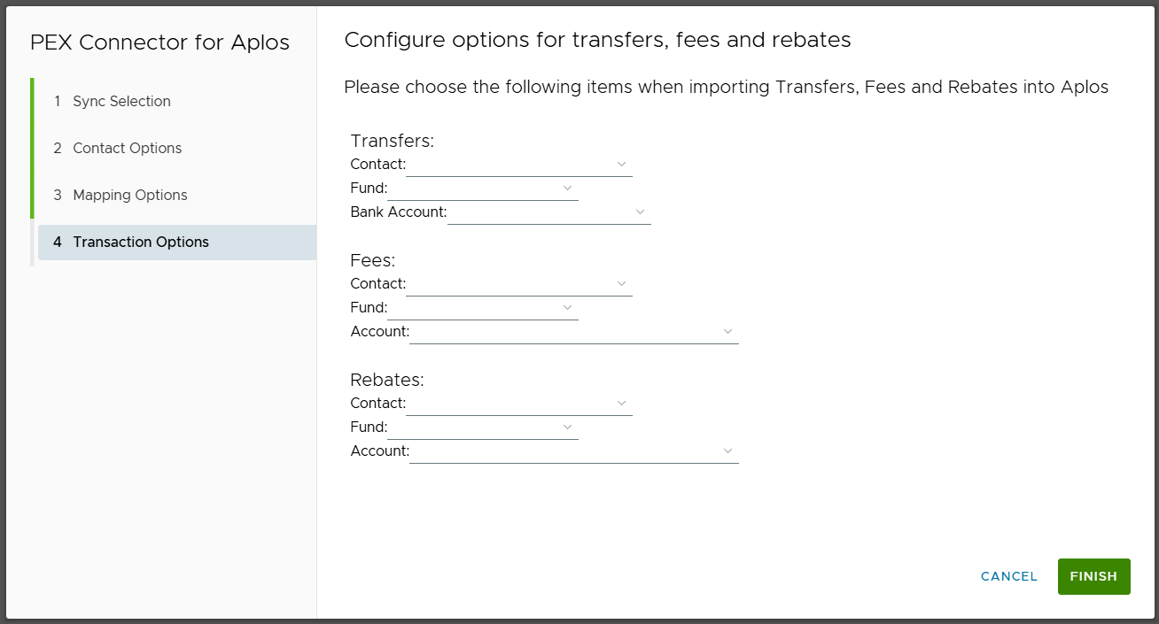 If you have any PEX rebates, the transactions for those rebates will be imported to Aplos and assigned to the account, fund, and contact you select.